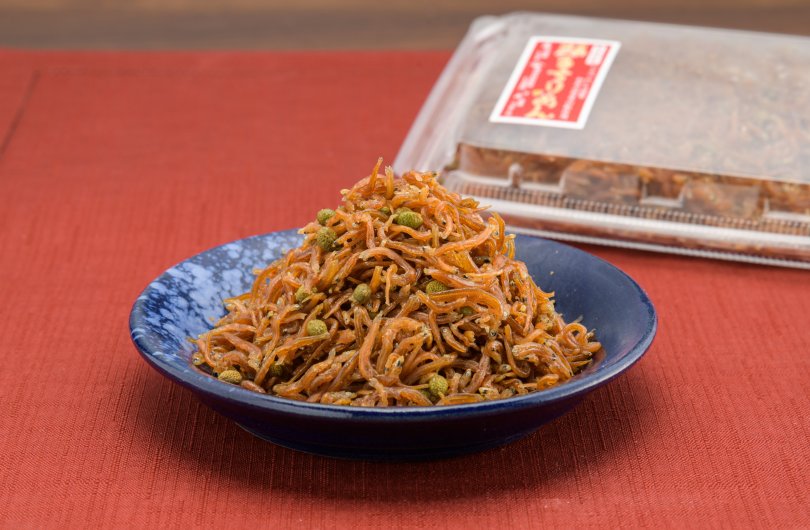 將本公司生產的「大洗吻仔魚」,加入在地大洗町月之井酒造店的純米酒,和茨城縣黑澤醬油店的二次釀造醬油「仁右衛門」一起燉煮,充分入味後撒上日本花椒。
